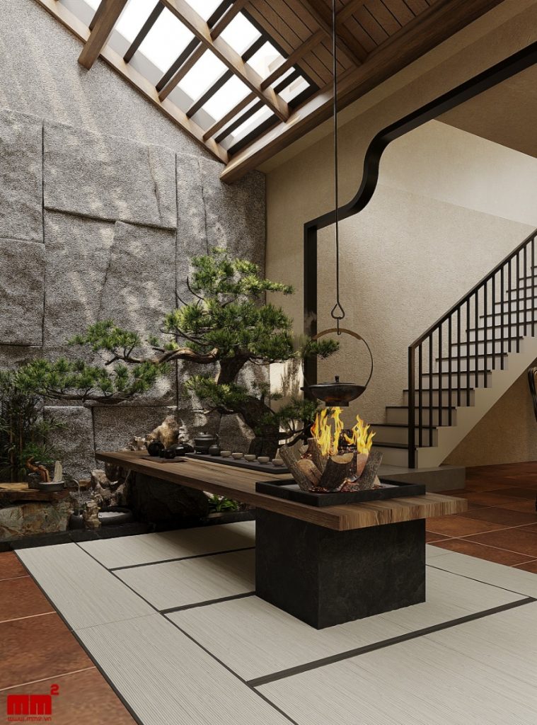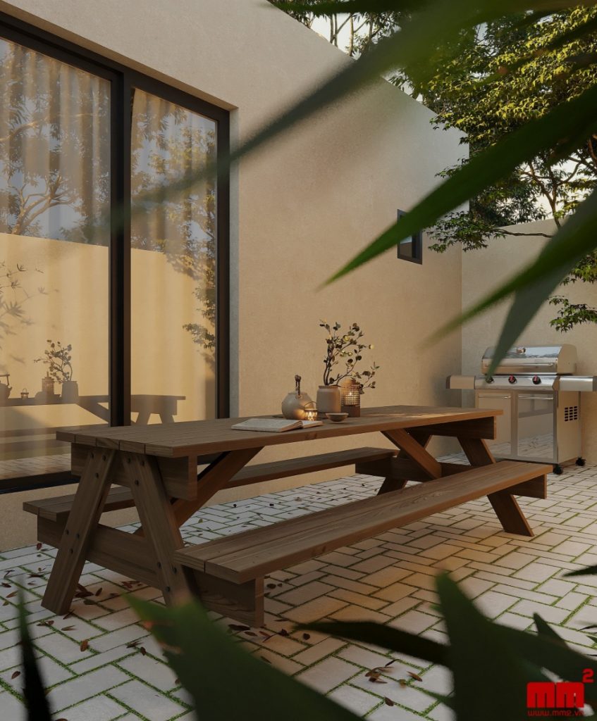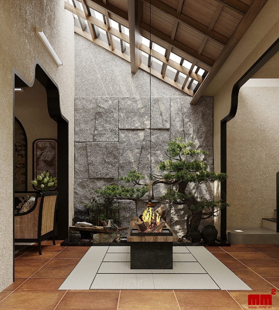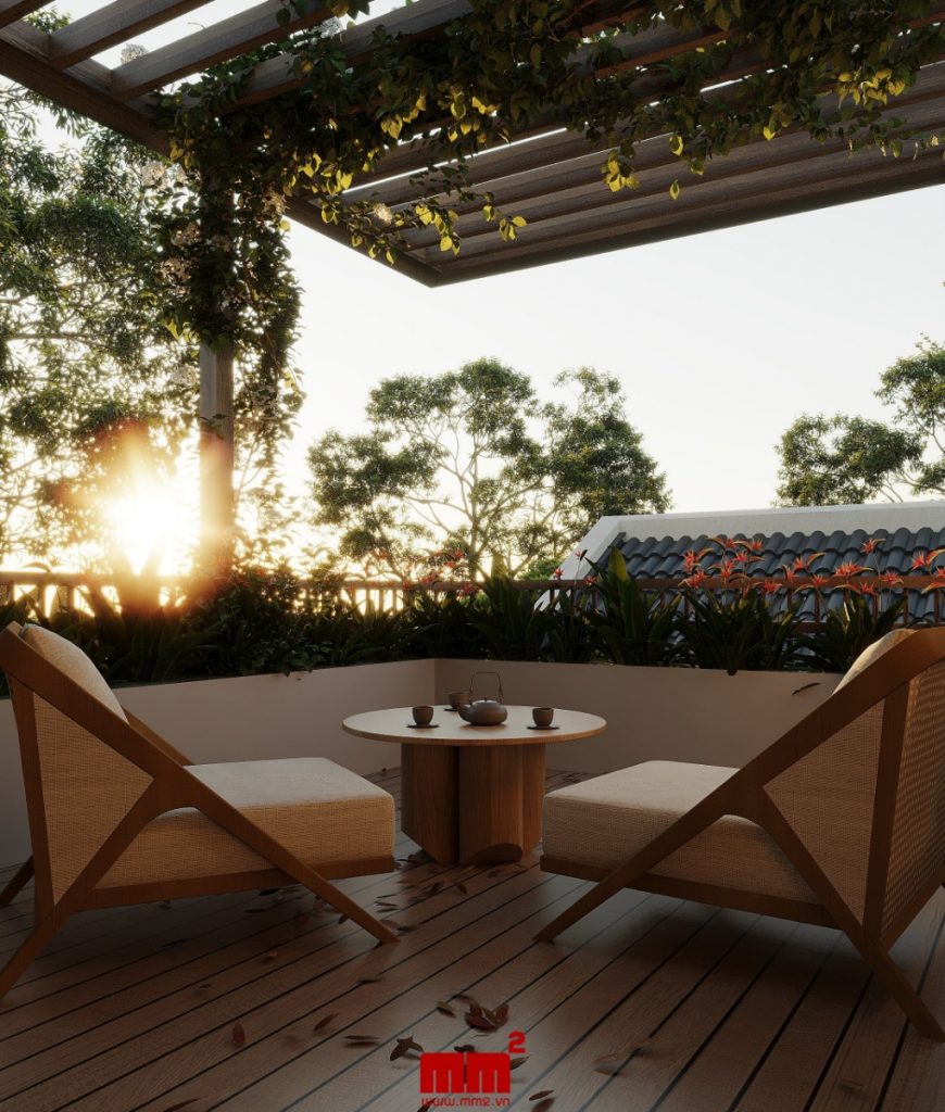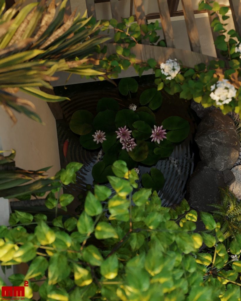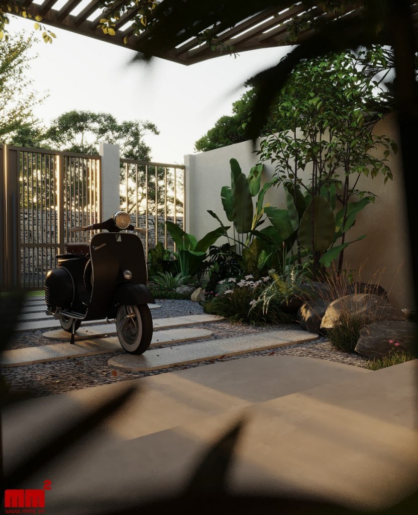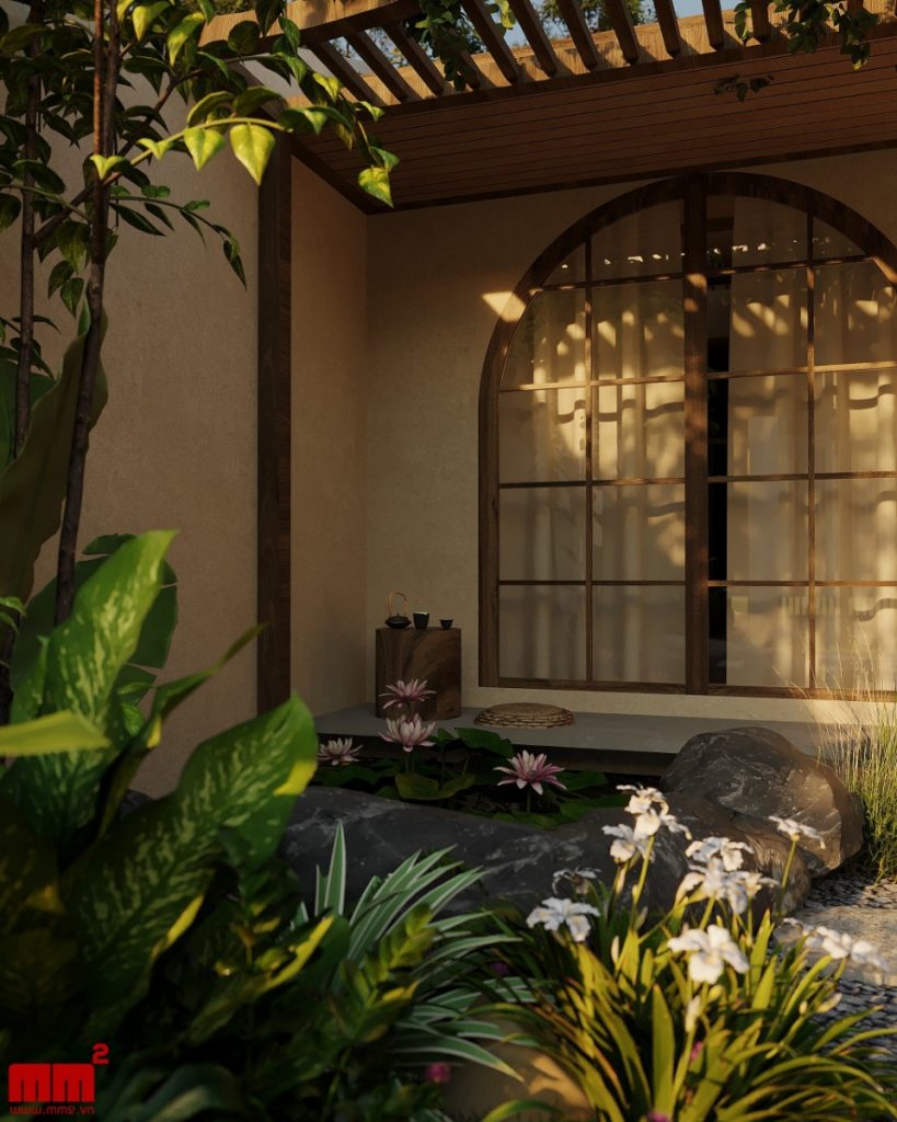 Một góc sân vườn nhỏ nhưng được thiết kế kỳ công với hồ cá, cây xanh và khu thưởng trà. Đây chính là nơi gia chủ có thể ngồi thư giãn, thiền định hay nhâm nhi tách trà sau những giờ làm việc căng thẳng. Mỗi bước đi trong lối nhỏ lát đá đều đưa bạn gần hơn với thiên nhiên.