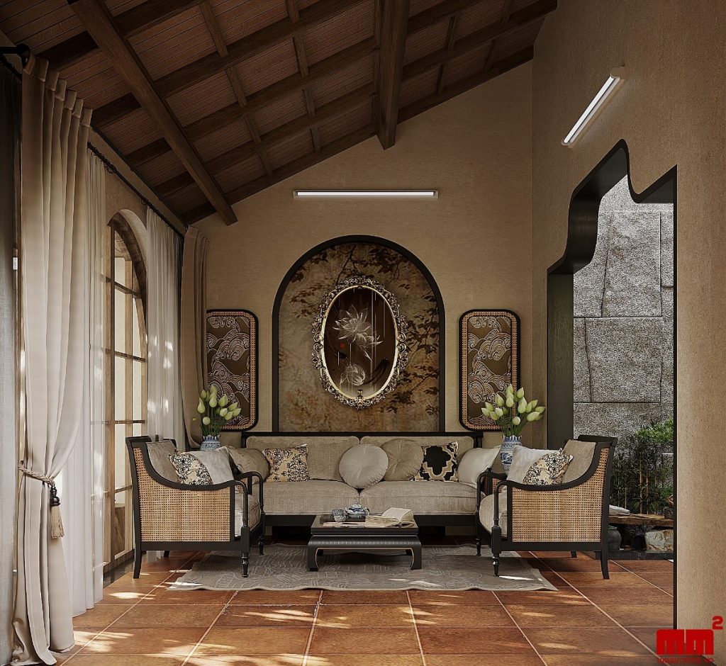 Tông màu trắng kem chủ đạo kết hợp mái ngói nâu trầm mang lại vẻ sang trọng, nhẹ nhàng nhưng vẫn rất quyền quý. Hệ cửa vòm gỗ lớn kết hợp rèm trắng mỏng làm nổi bật nét duyên dáng và bình yên của không gian sống – một lựa chọn hoàn hảo cho những ai yêu thích sự tĩnh lặng và phong cách sống chậm tại đảo ngọc.