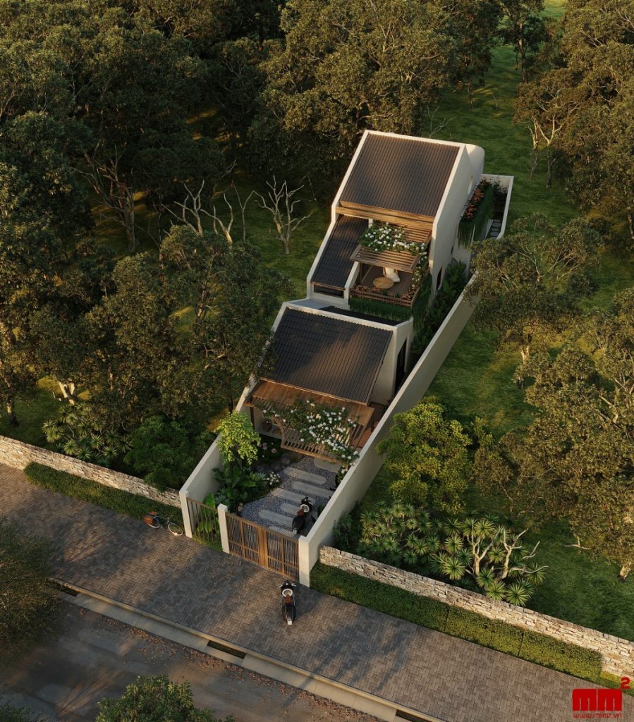 Nhìn từ trên cao, căn nhà mang đường nét tối giản nhưng tinh tế, kết hợp hài hòa giữa chất liệu hiện đại và yếu tố thiên nhiên. Sân vườn được bố trí khéo léo phía trước và bên hông nhà, tạo cảm giác nhẹ nhàng và riêng tư, lý tưởng cho một tổ ấm giữa lòng Phú Quốc xanh mát.