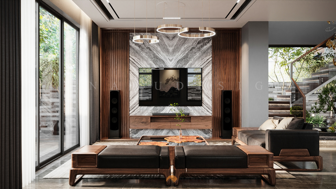 Chất liệu nội thất: Thường sử dụng các chất liệu cao cấp hiện đại như gỗ óc chó, gỗ công nghiệp An Cường, đá nhân tạo, cùng các bề mặt kim loại, da cao cấp.